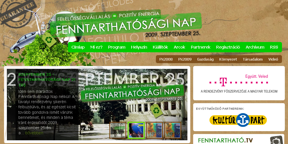 Annyi minden pörög-forog, hogy még szót sem ejtettem arról, hogy igen, félig már megújult a fenntarthatonap.info. Amellett, hogy teljes metamorfózison ment keresztül az oldal, beregisztráltuk a fenntarthatonap.hu domaint is (mert ugye, magyarok vagyunk), és már fel is került az első, június 5-i Home (Otthonunk) rendezvényünk filmje oda is. Sőt, elérkezett az idő, hogy már regisztrálni is lehet például az erre kialakított menüpont alatt (csak szólok, mert van, aki ezt nem találta meg, csak az erről szóló postot :))