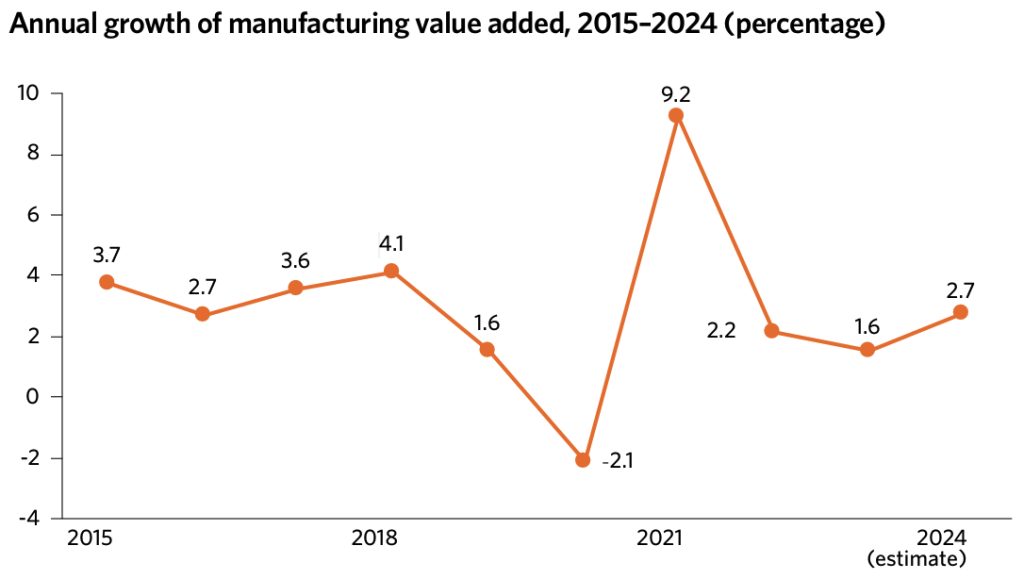 A feldolgozóipari hozzáadott érték éves növekedése, 2015–2024 (százalékban)