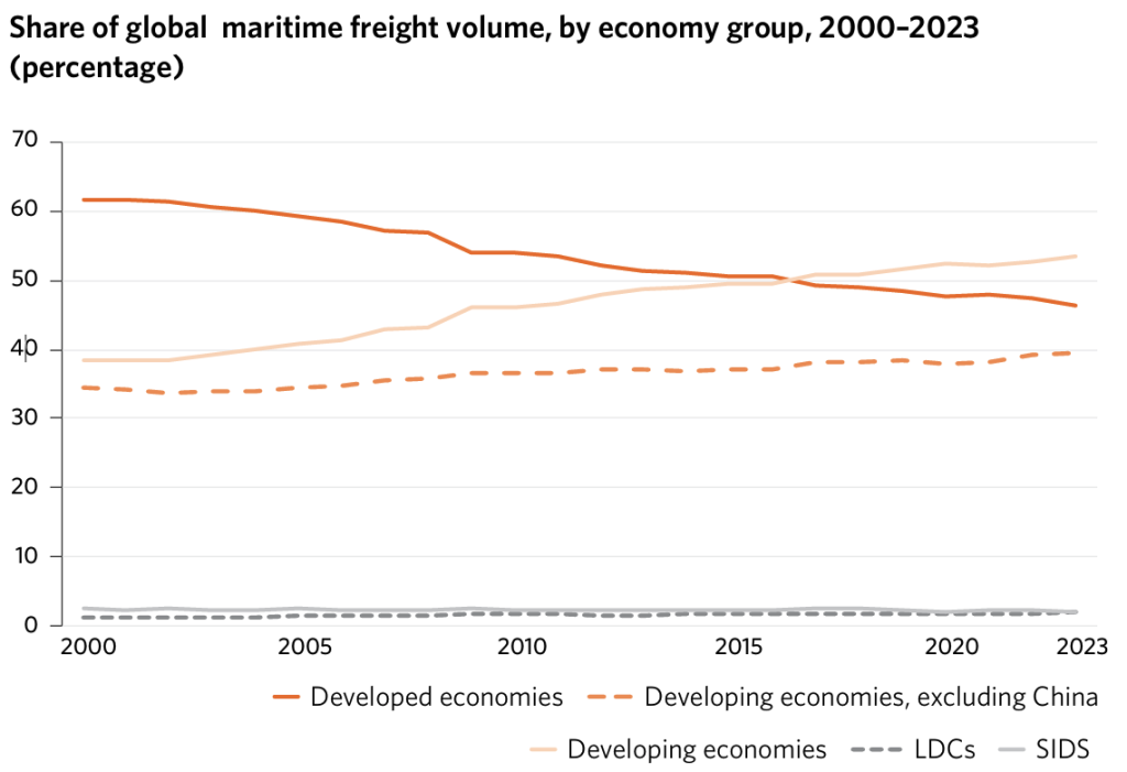 A tengeri árufuvarozás szerkezete átrendeződött, mivel 2023-ra a fejlődő országok már a globális forgalom 54%-át adták, ezzel háttérbe szorítva a fejlett gazdaságokat. Fontos megjegyezni, hogy a fejlődő országok ma már nem csupán nyersanyagok exportőrei, hanem egyre több félkész és késztermék importőrei és exportőrei is. Az országok részesedésének átalakulása betudható az európai gazdaság stagnálásának, valamint a kínai gazdaság robbanásszerű növekedésének.