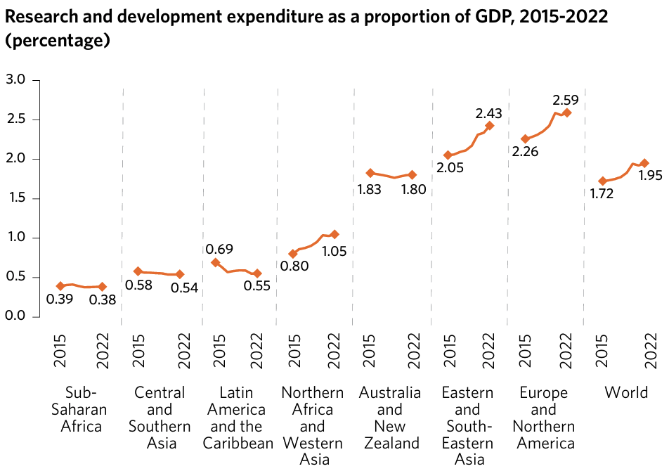 Ezzel ellentétben Közép- és Dél-Ázsiában, szubszaharai Afrikában, Ausztráliában és Új-Zélandon, valamint Latin-Amerikában és a Karib-térségben csökkent a GDP-arányos K+F befektetés. A ráfordításokban érzékelhető szakadékok azért is jelentenek nagy problémát, mert ezek a területi egyenlőtlenségek fokozódásához vezetnek. Emiatt fontos lenne a fejlődő országok kutatási hálózatainak bővítése és fejlesztéseinek támogatása.
