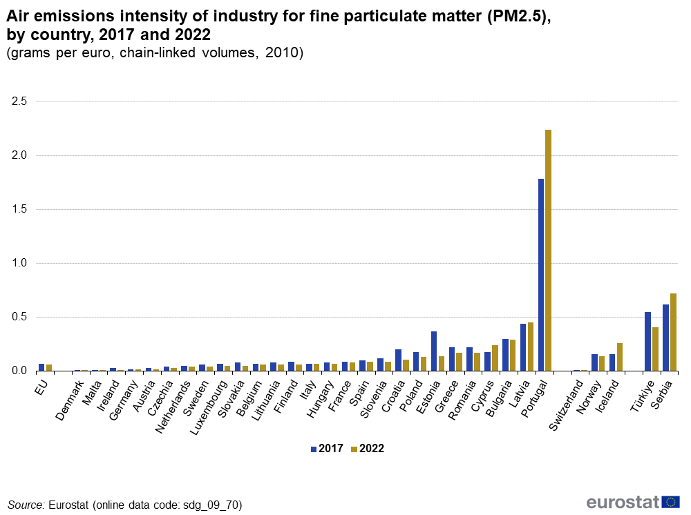Az ipar légköri kibocsátásának intenzitása a finom részecskék (PM2,5) tekintetében, 2017 és 2022 (gramm/euróban)