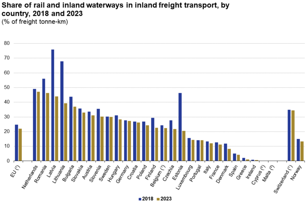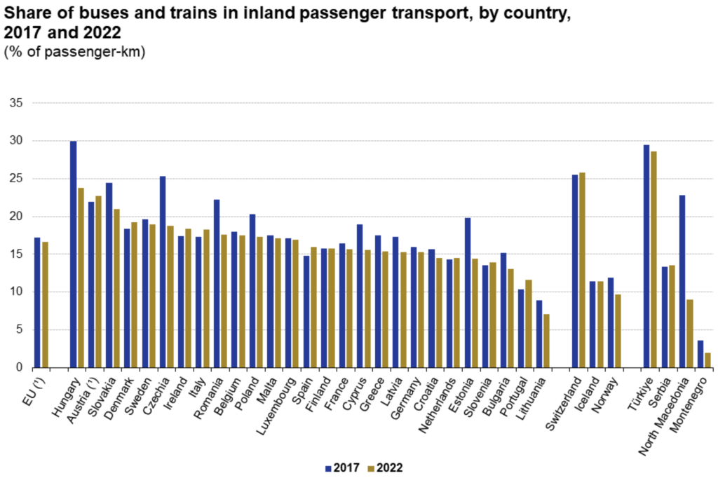 EU-s szinten 2022-ben Magyarországon volt a legnagyobb a buszok és vonatok részesedése a belföldi személyszállításban 23,8 %-os adattal, azonban áruszállítás tekintetében hazánk a középmezőnyben helyezkedett el a 2023-as statisztika alapján.