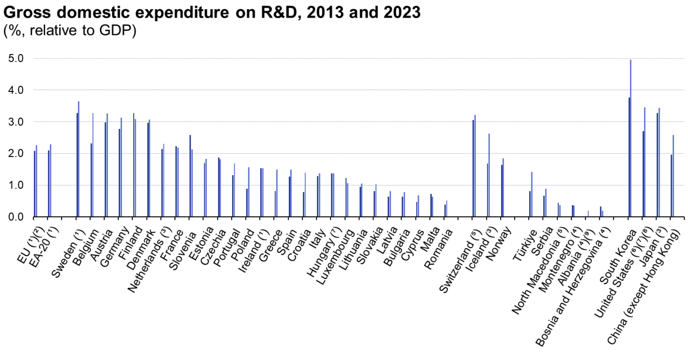 Az EU 2023-ban átlagosan a GDP 2,26 %-át fordította kutatás-fejlesztésre, míg ez az arány Magyarországon csak 1,38 % volt. Az alábbi ábrán látható, hogy 2013 és 2023 között a kutatás-fejlesztésre itthon érdemben nem növekedett a GDP arányos pénzügyi ráfordítás.