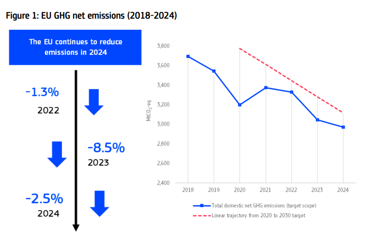 - Az Európai Unió (CAPR): 2024-ben 2,5%-kal csökkentette nettó üvegházhatású gáz (ÜHG) kibocsátását 2023-hoz képest.