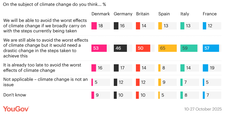 A válaszadók 14-19%-a szerint már túl késő elkerülni a katasztrófát. Spanyolországban mindössze 8% hiszi, hogy túl késő van.
