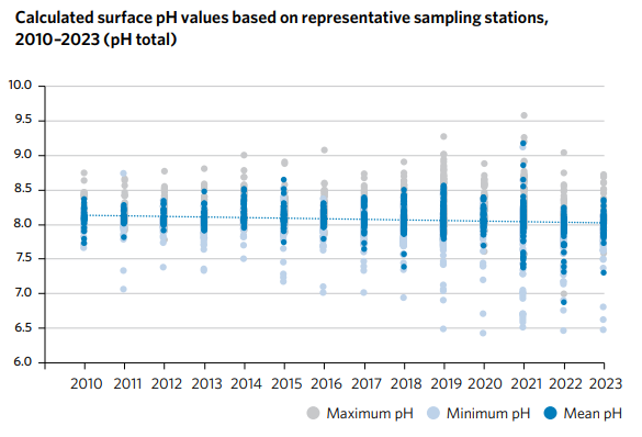 • A globális átlagos felszíni tengervíz pH-ja az 1985-ös 8,11 értékről 2024-re 8,04-re csökkent. Bár ez a szám kicsinek tűnhet, a pH-skála logaritmikus, így ez jelentős változást takar.