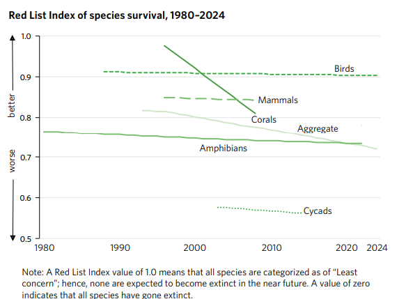 A 2025-ös adatok szerint az index globális értéke 1993 óta 12%-kal romlott. Jelenleg több mint 47 000 fajt fenyeget közvetlenül a kihalás veszélye. A csökkenés minden főbb fajcsoportot érint, de a korallok, a kétéltűek és a cikászok helyzete a legkritikusabb. A korallzátonyok pusztulása különösen aggasztó, mivel ezek a tengeri biodiverzitás központjai, és összeomlásuk dominóhatást indíthat el a tengeri táplálékláncban.