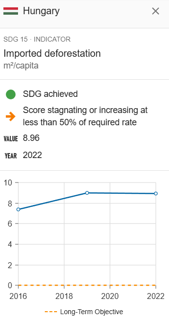 Magyarország az összesített SDG Indexben a 21. helyen áll (80,4 pont), megelőzve számos régiós és nyugat-európai országot. Ez az eredmény azonban az összes 17 célkitűzés átlaga. Ha kifejezetten a 15. célt vizsgáljuk, a dashboard „sárga” (mérsékelt kihívások) és „narancs” (jelentős kihívások) jelzéseket mutat.