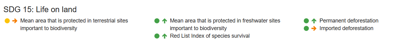Magyarország az összesített SDG Indexben a 21. helyen áll (80,4 pont), megelőzve számos régiós és nyugat-európai országot. Ez az eredmény azonban az összes 17 célkitűzés átlaga. Ha kifejezetten a 15. célt vizsgáljuk, a dashboard „sárga” (mérsékelt kihívások) és „narancs” (jelentős kihívások) jelzéseket mutat.