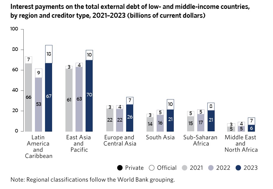 2023-ban az LMIC-k bruttó nemzeti jövedelmük (GNI) 3,7%-át fordították adósságszolgálatra, ami tovább feszítette az eleve szűkös erőforrásokat, és kevesebb mozgásteret hagyott az egészségügyi, oktatási és infrastrukturális beruházások számára. A tőketörlesztések közel 1%-kal, 950,9 milliárd dollárra emelkedtek, míg a kamatfizetések 37,1%-kal ugrottak meg, elérve a 405,3 milliárd dollárt – mindkettő történelmi csúcs.