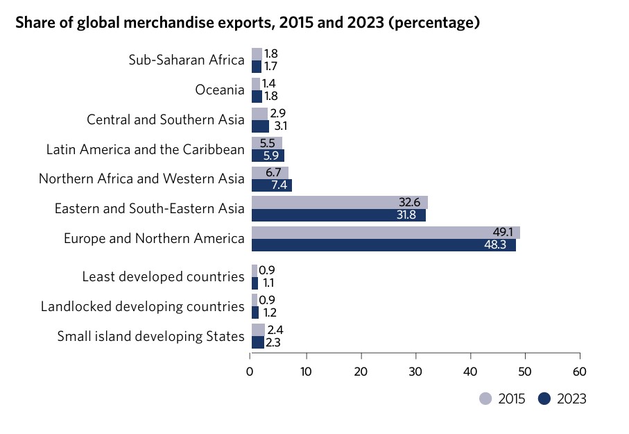A 2023-as globális exporton belül Európa és Észak-Amerika részesedése közel a felét tette ki, míg Kelet- és Délkelet-Ázsia csaknem egyharmadot. A többi régió hozzájárulása alacsony maradt, 1,7 és 7,5% között. A kis szigetállamok (SIDS) részesedése enyhén csökkent: a 2015-ös 2,4%-ról 2023-ra 2,3%-ra. A szárazfölddel elzárt fejlődő országok (LLDC-k) és a legkevésbé fejlett országok (LDC-k) csak minimális növekedést értek el, részesedésük mindössze 1,2%, illetve 1,1% volt.