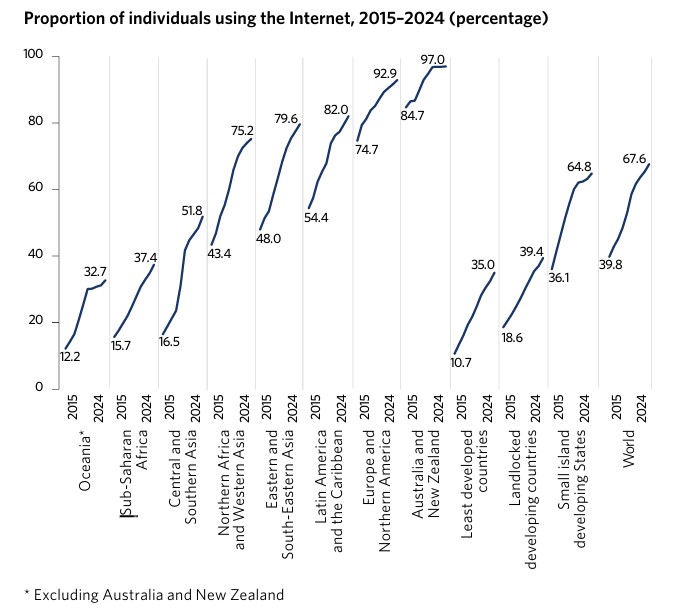 2024-ben világszerte 5,5 milliárd ember használta az internetet, ami a világ népességének 68%-át jelenti. Ugyanakkor a globális lakosság egyharmada – 2,6 milliárd ember – továbbra is offline maradt. Bár a globális internethasználat 2015 és 2024 között 40%-ról 68%-ra nőtt (ami évi átlagosan 6,1%-os növekedési ütemnek felel meg), az egyetemes használat – vagyis a 95%-os lefedettség – továbbra is távoli cél.