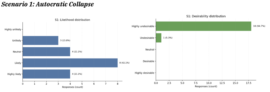Legvalószínűbb forgatókönyvnek az Autokratikus összeomlást látták a szakértők, míg legvalószínűtlenebbnek az Ökokráciát. Javasoltnak mindössze a Demokratikus gondoskodás a természetről elnevezésű jövőképet minősítették, miközben az 1. lehetőséget kifejezetten nemkívánatosnak tartották. A 2. lehetőség számos központi elemet tartalmaz a nemnövekedési és a növekedés utáni elméletekből, valamint fontos részét képezi a fenntartható átalakulás is.