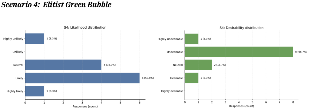 - Elitista zöld buborék: az üzleti gyakorlatok látszólag összhangban vannak a kollektív ökológiai és társadalmi célokkal, azonban ezeket az eredményeket a kevésbé privilegizált területeken folytatott kizsákmányoló gyakorlatok tartják fenn. A zöldre mosott kitermelés dominál, elfedve az intenzív természetkincs-kitermelést és az elit fogyasztási szokásait. A társadalmi egyenlőtlenség fokozódik, az információk csak egy szűk csoport számára válnak elérhetővé, az innovációk pedig csak a privilégiumokat erősítik a rendszerszintű változás helyett. Az éghajlatváltozás megzavarja az ellátási láncokat, Európa pedig katonai beavatkozással biztosítja az erőforrásokat. A politikai hatalom az elit kezében összpontosul, miközben a zöld gyarmatosítás normalizálódik. A technológiai innovációt elit intézmények alakítják, míg az oktatási rendszerek a technológia-vezérelt megoldásokat részesítik előnyben.