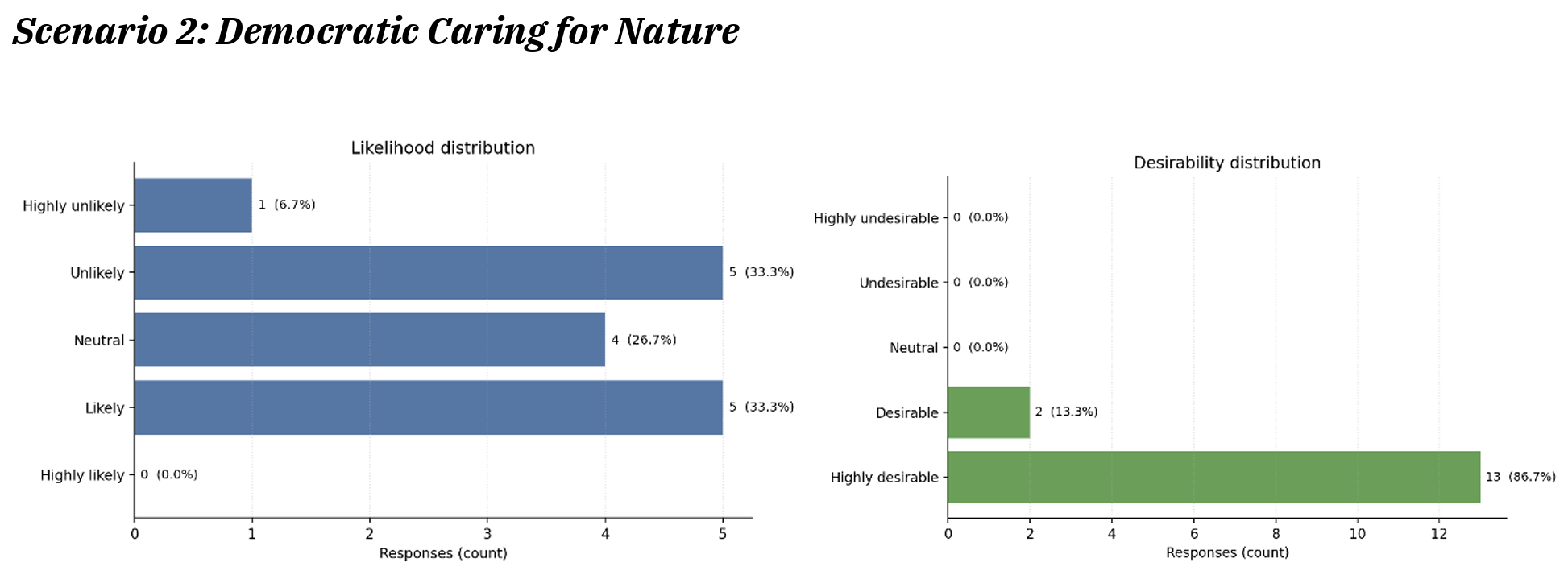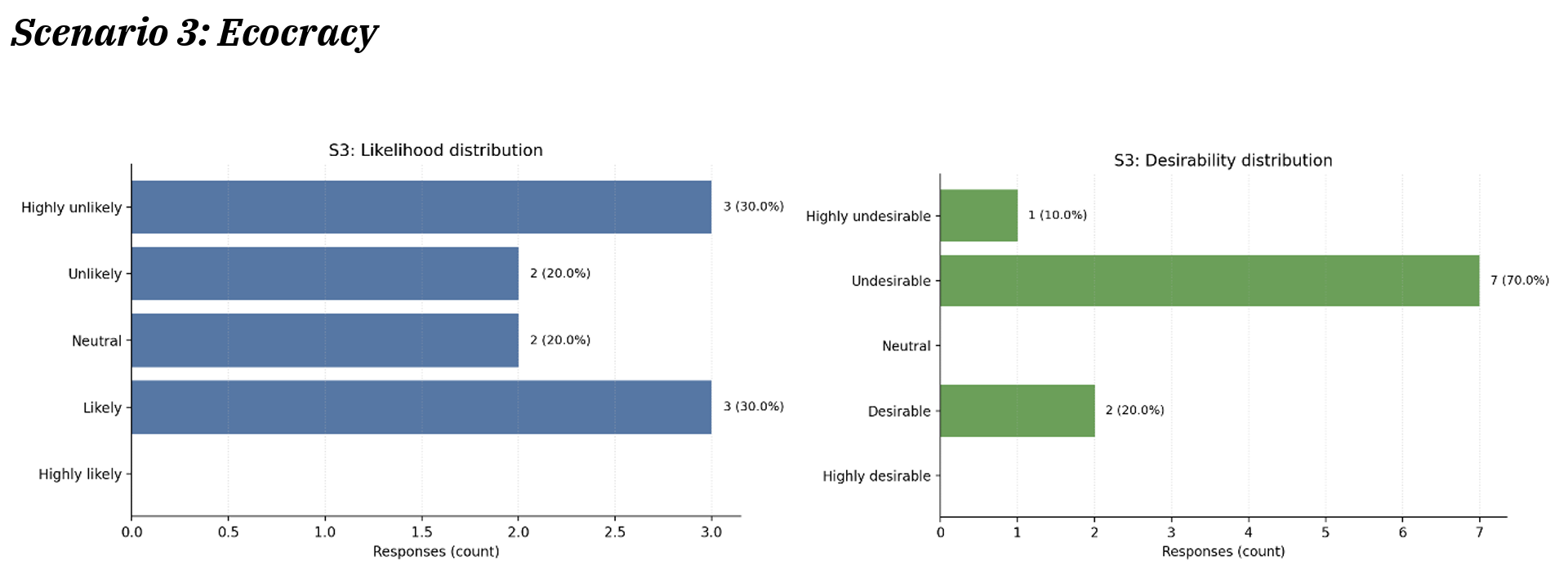 Legvalószínűbb forgatókönyvnek az Autokratikus összeomlást látták a szakértők, míg legvalószínűtlenebbnek az Ökokráciát. Javasoltnak mindössze a Demokratikus gondoskodás a természetről elnevezésű jövőképet minősítették, miközben az 1. lehetőséget kifejezetten nemkívánatosnak tartották. A 2. lehetőség számos központi elemet tartalmaz a nemnövekedési és a növekedés utáni elméletekből, valamint fontos részét képezi a fenntartható átalakulás is.