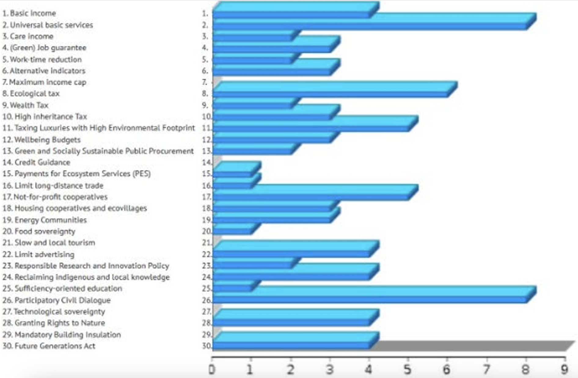 Ezek közül a legfontosabb intézkedésnek a részvételi polgári párbeszédet választották, azonban népszerűek voltak még a felelősségteljes kutatási és innovációs politika, a vagyonadó, az ökológiai adó, az általános alapszolgáltatások és az őslakosok és a helyi lakosság tudásának visszaszerzése is.