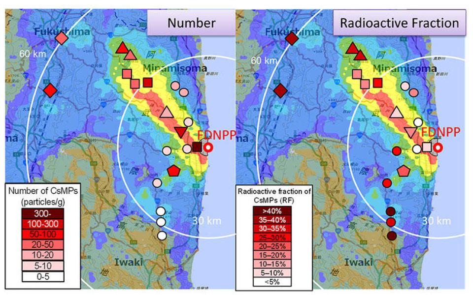 Az ábra a talajgrammonkénti céziumban gazdag mikrorészecskék számát, valamint a mikrorészecskékhez kapcsolódó teljes talajcézium-radioaktivitás hányadát mutatja a Fukusima Daiichi Atomerőmű körül gyűjtött minták széles skálájára